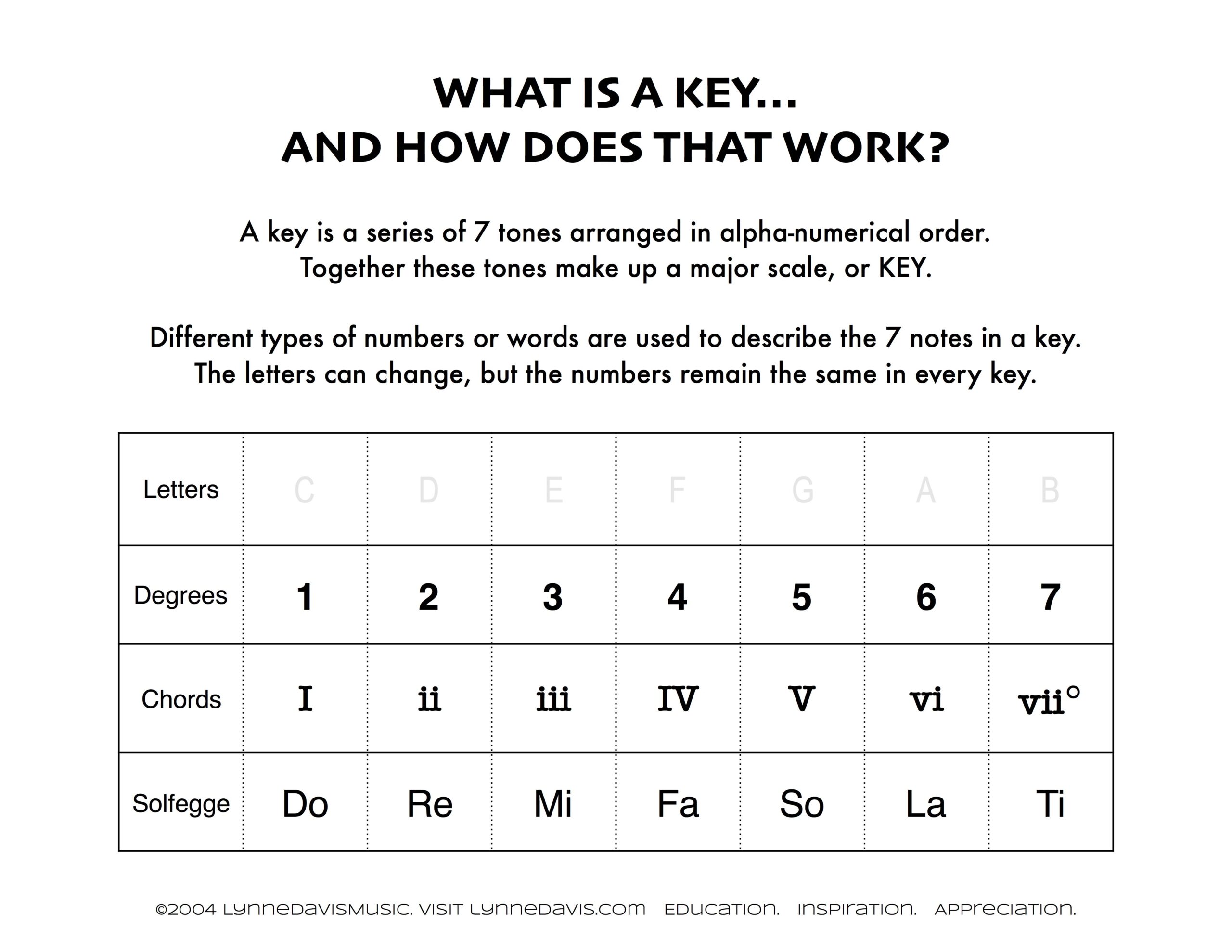 This single-page document gives a clear and concise answer to the question, "What IS a key?" Includes a table showing the multiple ways the notes of a key can be expressed using letters, Arabic numbers, Roman numerals and Solfegge syllables.